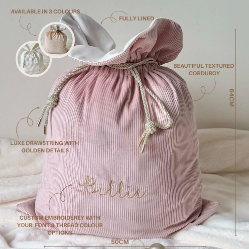 Celebrate the season in style with our lined luxury personalised Santa sack, handmade from beautiful textured corduroy finished with gorgeous golden drawstring for easy closure. Designed to elevate your festive décor, this elegant sack brings a touch of timeless charm to Christmas morning.